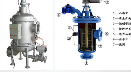 當水從進水口進入過濾器濾筒內部,雜質被攔截在過濾筒內壁,過濾后的干凈水從出水口流出,當濾筒內壁的雜質越積越多時,自清洗過濾器進出口的壓差達到預設值、達到清洗時間或手動預制時,過濾器將開始自清洗過程,整個自清洗過程包含兩個步驟:打開位于自清洗過濾器上的自動排污閥;電機帶動自清洗過濾器濾網內的清洗刷,被濾網所攔截下來的雜質從排污閥排出,清洗時系統不斷流,自清洗過濾器的整個運行過程由隨機配備的一個智能控制箱來控制。控制方式可選壓差、時間、手動及PLC控制。