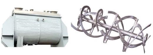 螺條式混合機主要有傳動部件、筒體、筒蓋、特殊布置的螺條主軸、出料閥等組成。該螺條式混合機由電機經減速機驅動特殊布置的螺條主軸旋轉,中心出料時外部的螺條將物料移到中心位置,內部的螺條將物料推向端板,兩股物料作相互擴散、對流、剪切、錯位和輻射狀運動,從而使物料在極短的時間內達到混合均勻的效果。根據物料特性可選用--連續式螺條、斷續式螺條和槳葉式螺條。三種螺條根據出料點不同可以排列成中心和端部卸料兩種形式。