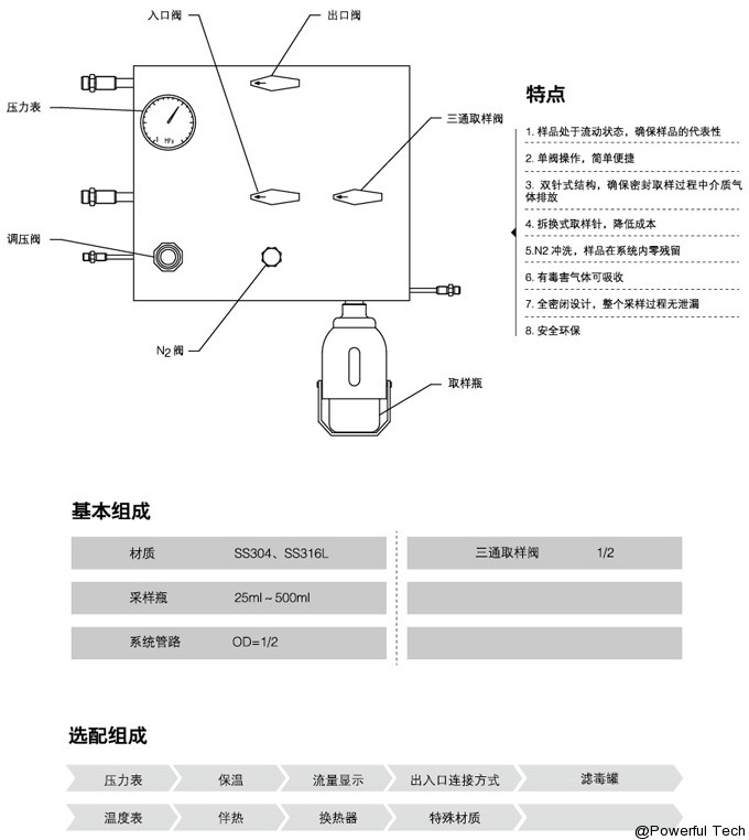 樣品通過三通取樣閥在系統內循環,始終處于流動狀態。切換三通取樣閥,完成樣品的采集;通過N2吹洗,將系統內殘余樣品導入取樣瓶,使系統處于無殘留潔凈狀態,排出的有毒有害氣體可通過濾毒罐吸收。全密閉取樣器設計保證操作安全性并減少對環境的危害。